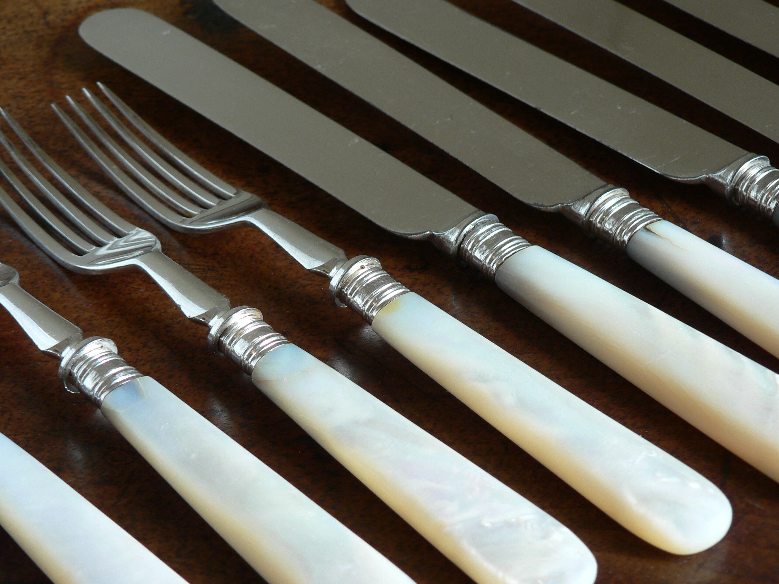 【特徴】約100年前のカトラリーセット。白蝶貝は古くから高級な真珠として扱われてきました。『マザーオブパール(MOP)』とも呼ばれています。