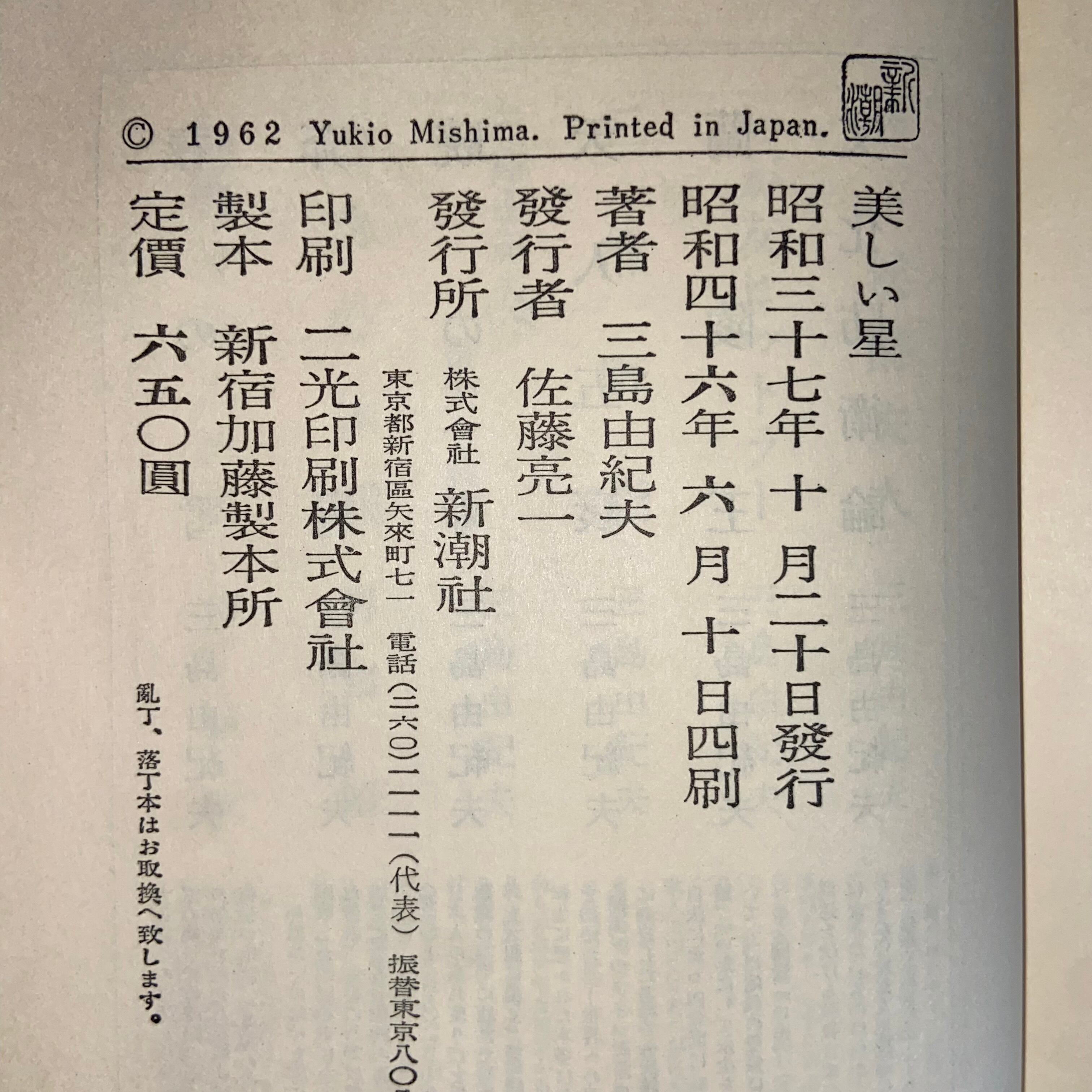 【1962】美しい星 三島由紀夫 第四刷