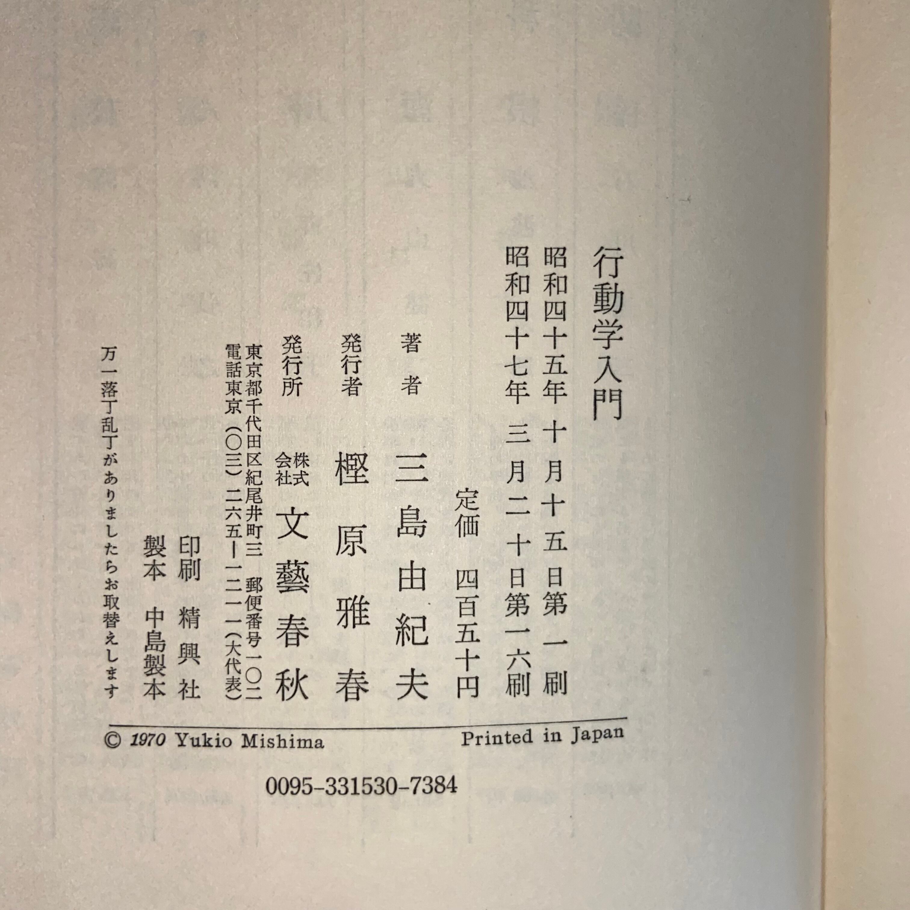 【1970】行動学入門 三島由紀夫 第十六刷