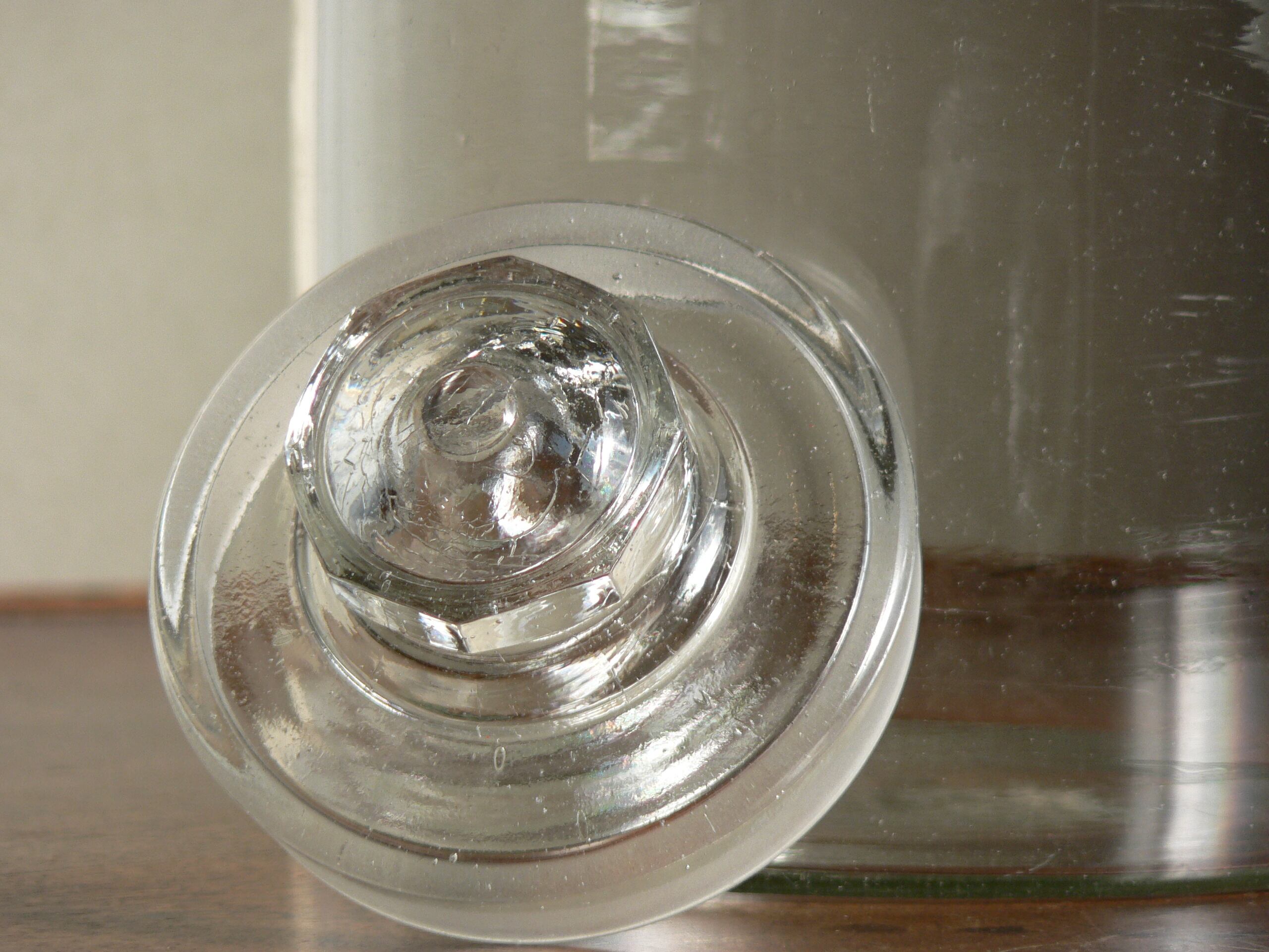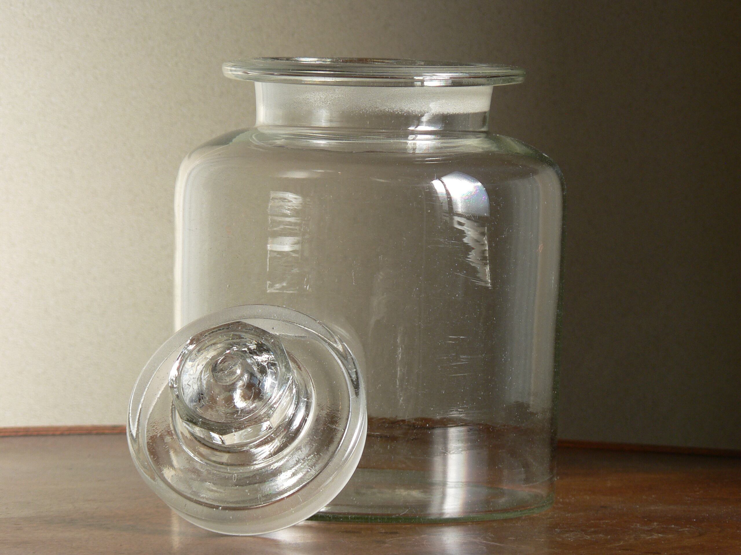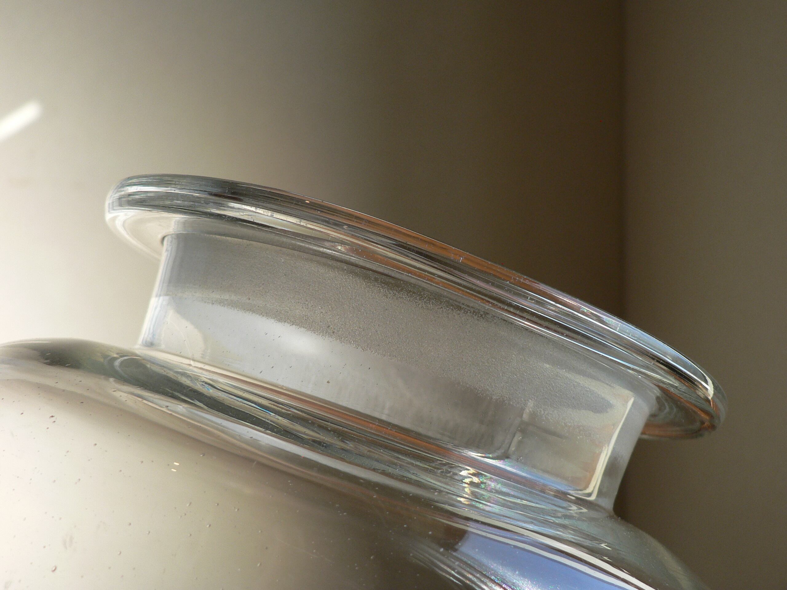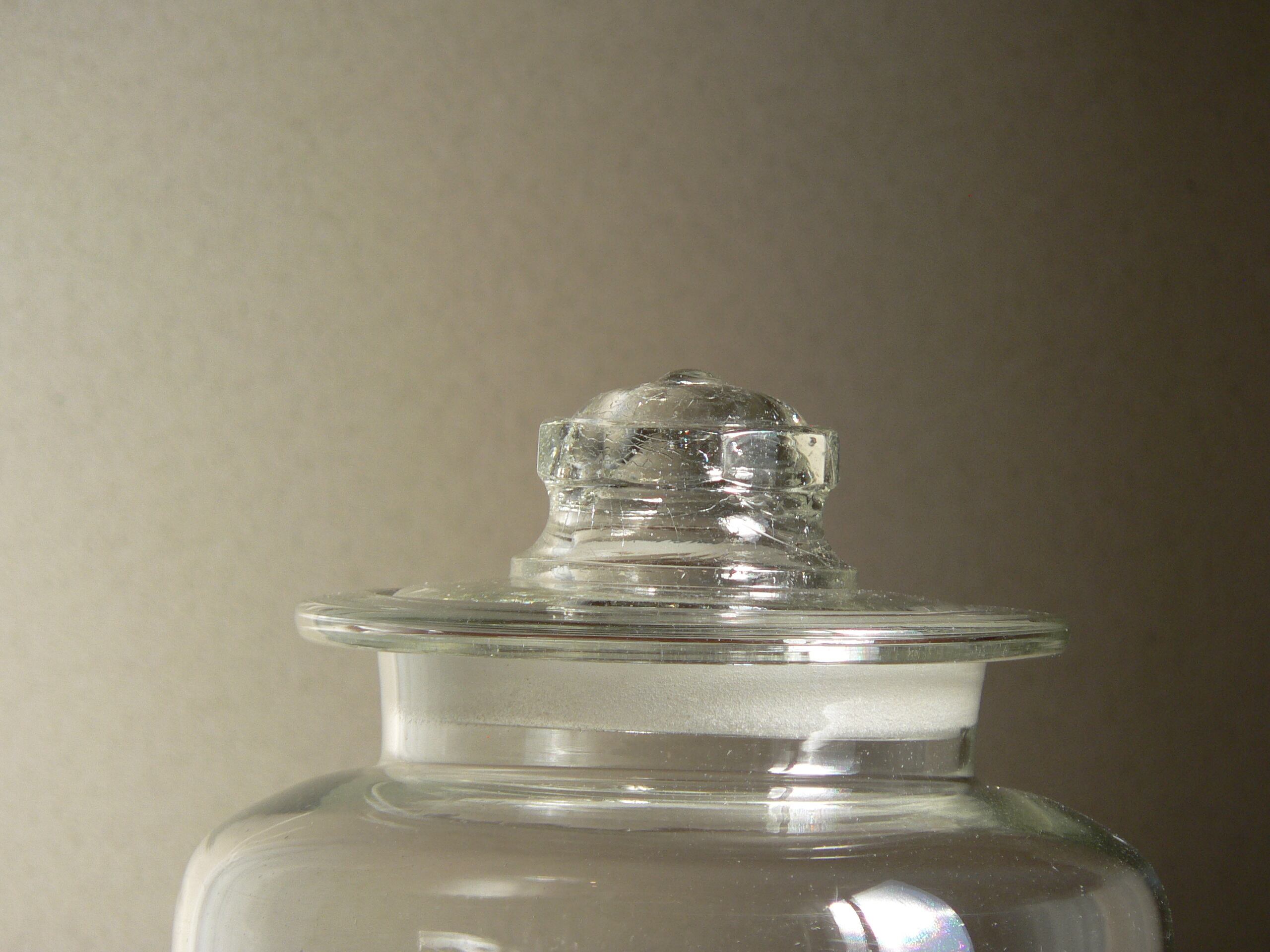 蓋が氷のように分厚いガラス保存瓶です。蓋は磨りガラスになっています。全体的に細かな気泡が数多くあります。少しブラックライトに反応します。蓋や底部、側面など蛍光緑色になります。ウランが微量混入しています。