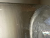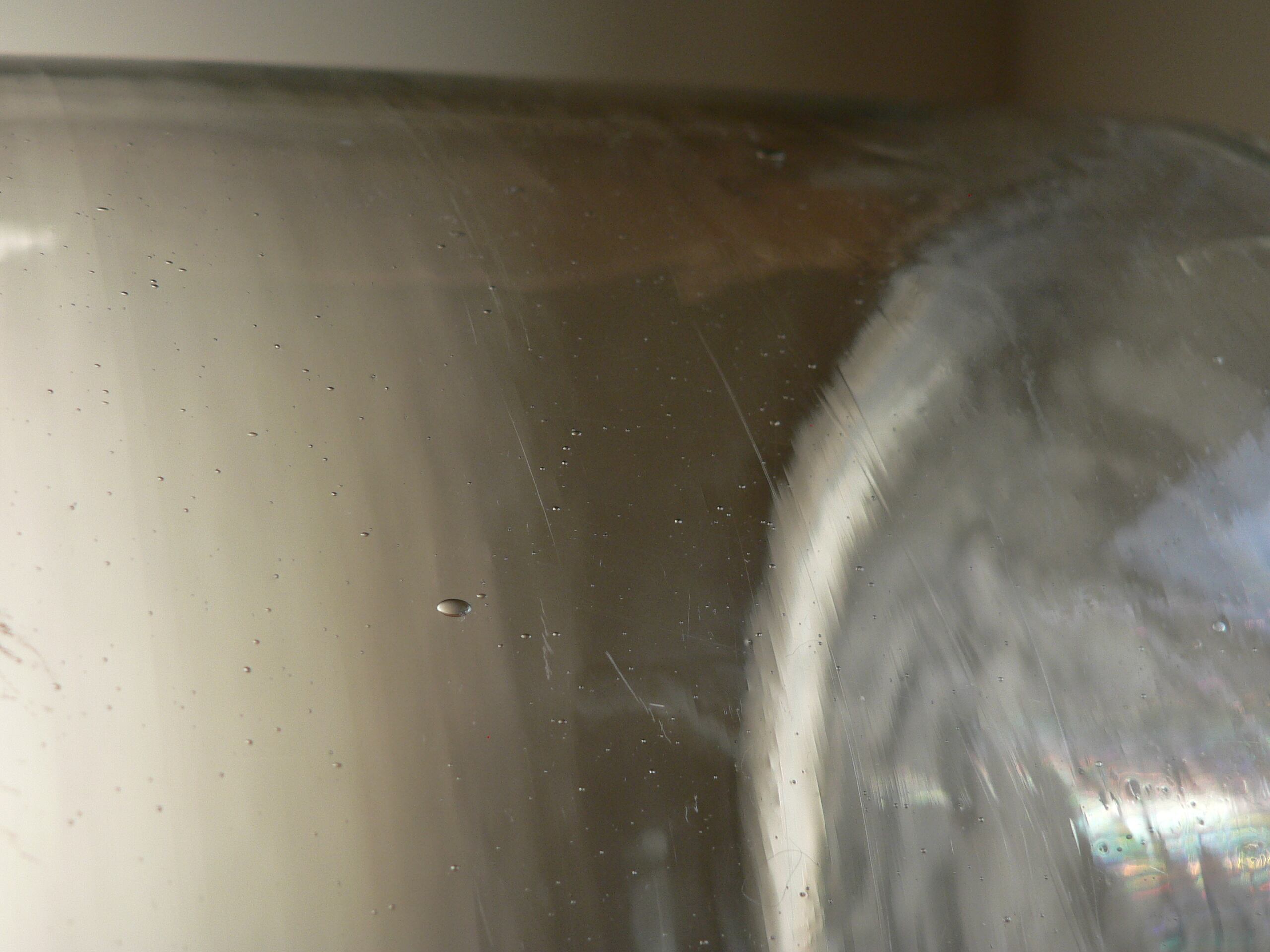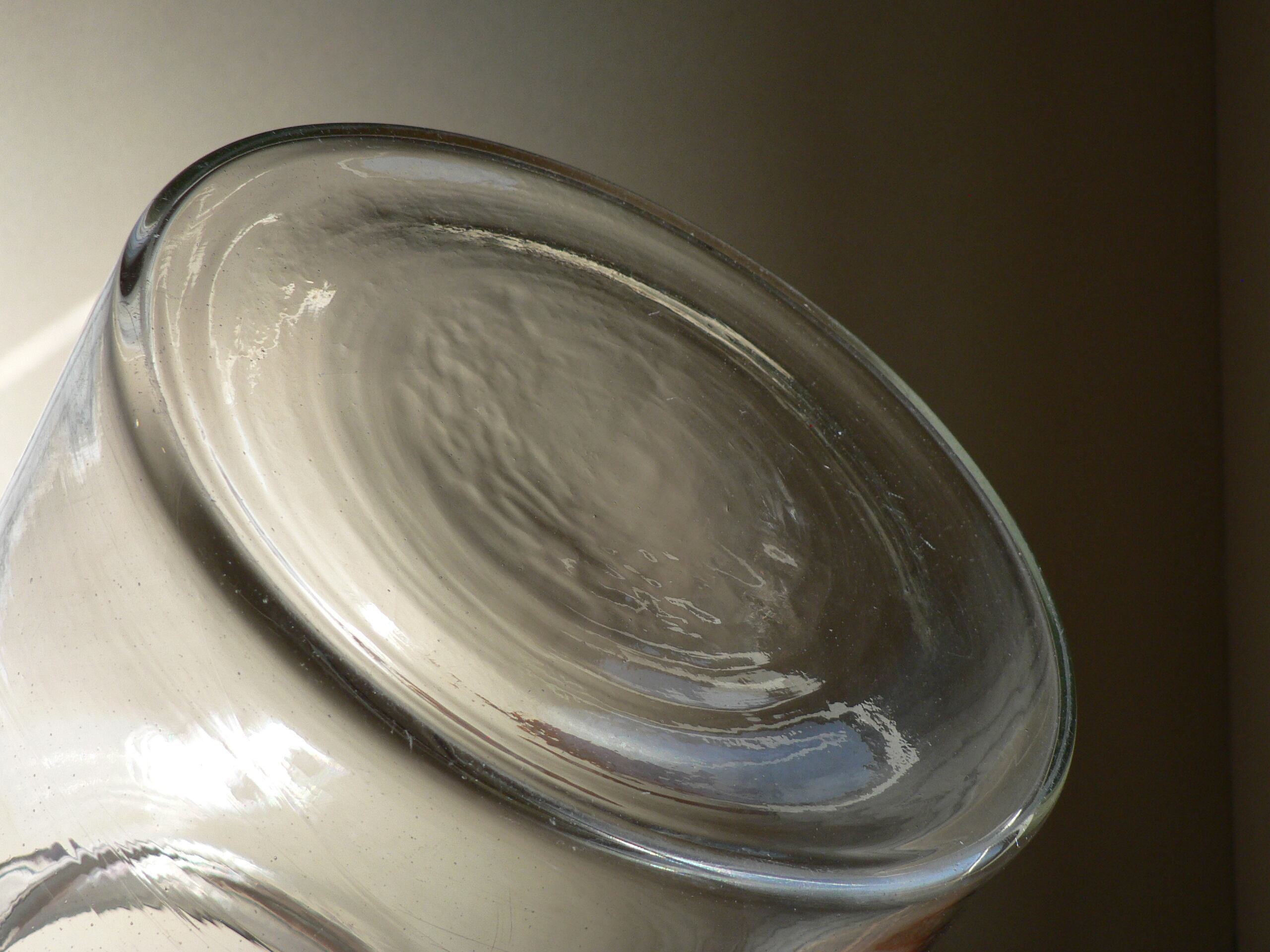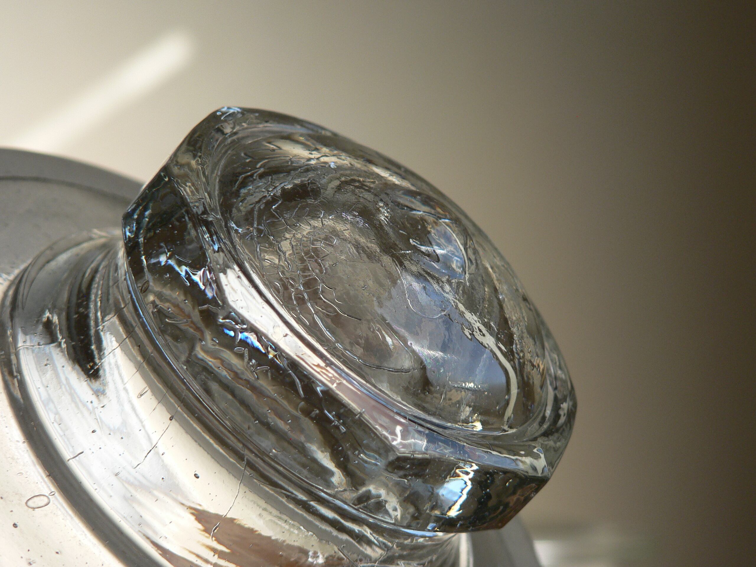 蓋が氷のように分厚いガラス保存瓶です。蓋は磨りガラスになっています。全体的に細かな気泡が数多くあります。少しブラックライトに反応します。蓋や底部、側面など蛍光緑色になります。ウランが微量混入しています。
