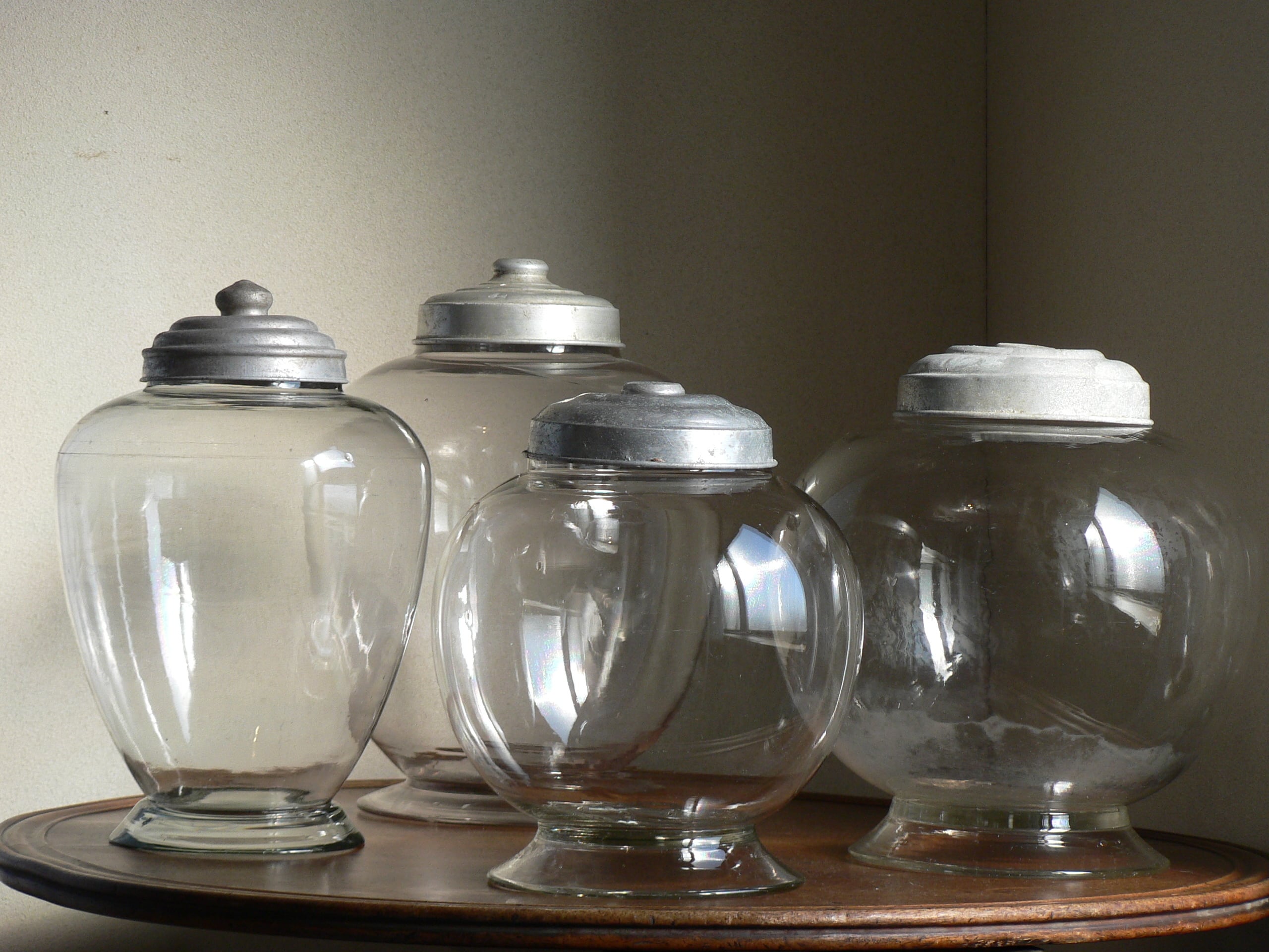 昭和初期から使われていた駄菓子瓶。煎餅など和菓子を販売するお店で特に使われていました。職人により作られているモノです。地球瓶型にガラスを入れて吹きながら成型して作ります。気泡の混入があります。
