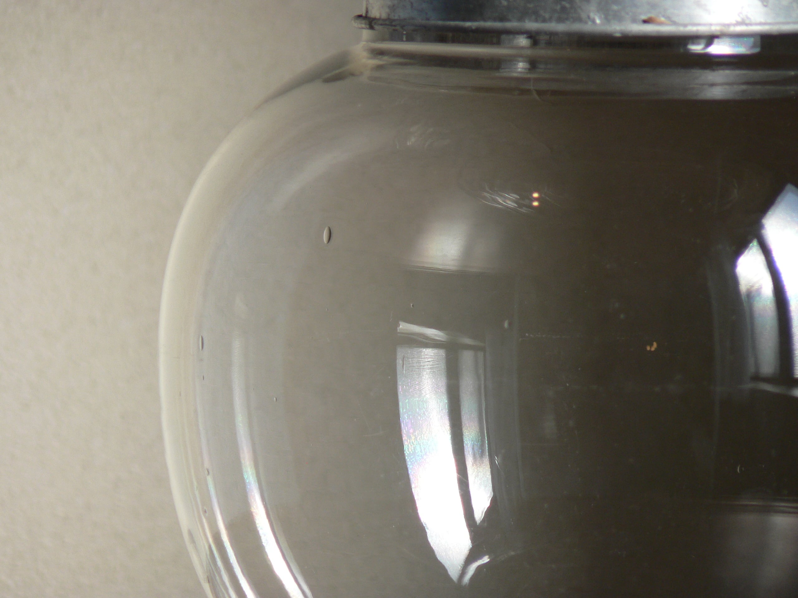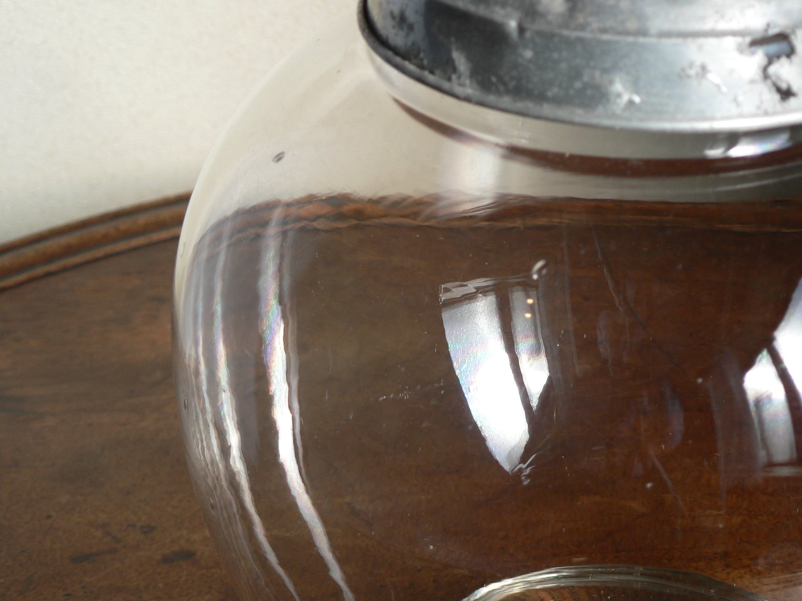 昭和初期から使われていた駄菓子瓶。煎餅など和菓子を販売するお店で特に使われていました。職人により作られているモノです。地球瓶型にガラスを入れて吹きながら成型して作ります。気泡の混入があります。蓋に少しダメージあります。