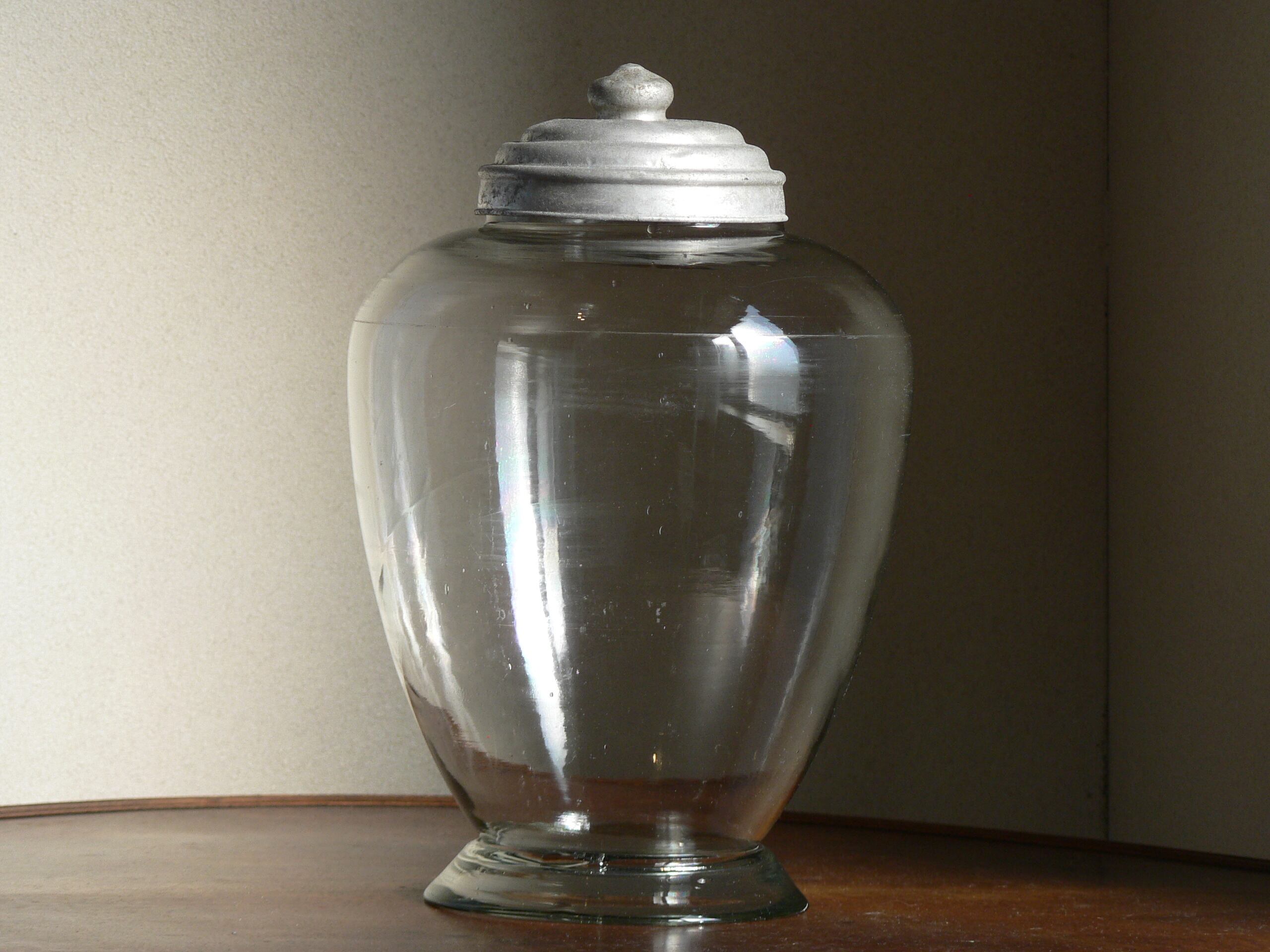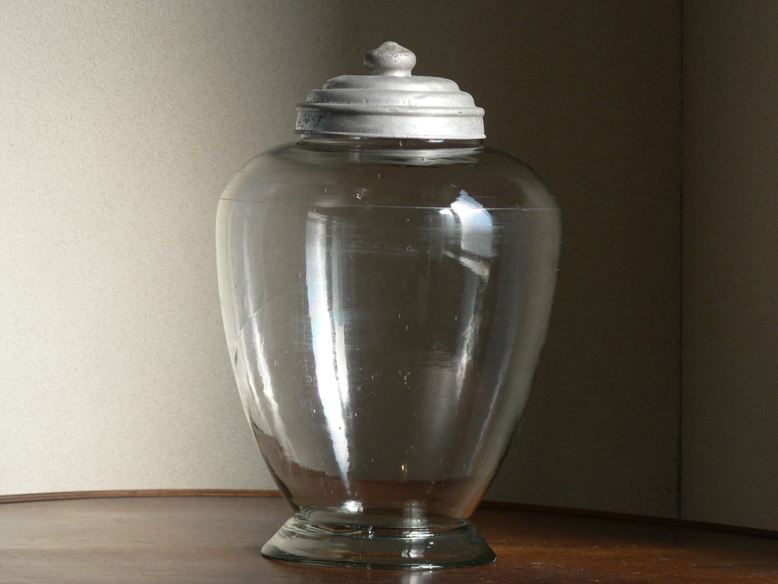 昭和初期から使われていた駄菓子瓶。煎餅など和菓子を販売するお店で特に使われていました。職人により作られているモノです。地球瓶型にガラスを入れて吹きながら成型して作ります。気泡の混入があります。