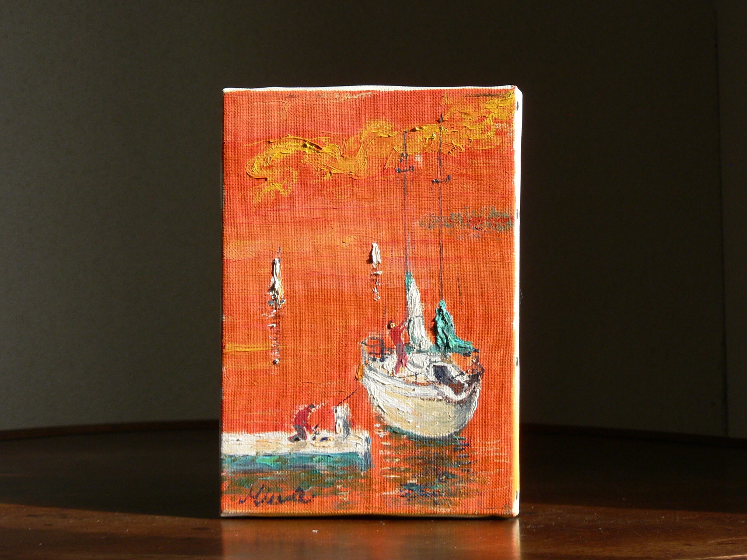 南フランス、コートダジュールの港風景。たたまれた帆と夕焼けのコントラストが印象的。